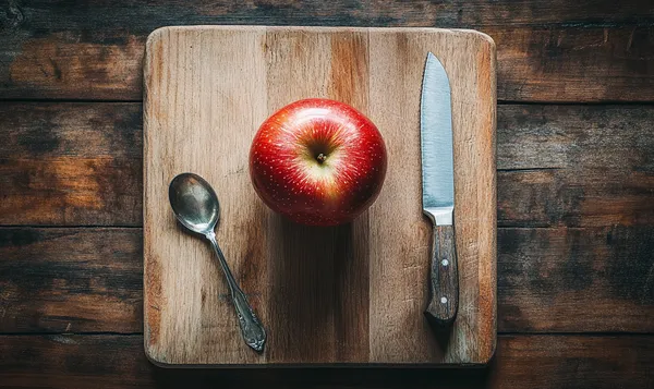 - Apfel positionieren: Legen Sie den Apfel mit dem Stiel nach oben auf ein stabiles Schneidebrett und halten Sie ihn gut fest.