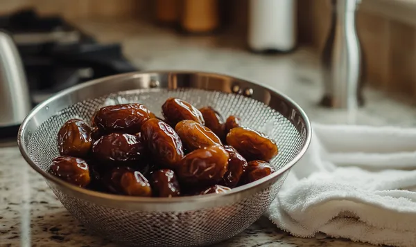 Sie können die Datteln auch in warmem Wasser auftauen, dies kann jedoch ihre Konsistenz leicht verändern. Legen Sie die Datteln für einige Minuten in eine Schüssel mit warmem Wasser.