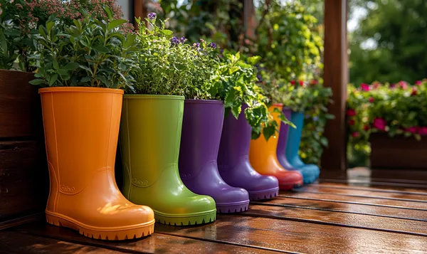 Hängen Sie die Gummistiefel an Zäunen, Geländern oder Wänden auf. Dies schafft vertikale Gärten und spart Platz.