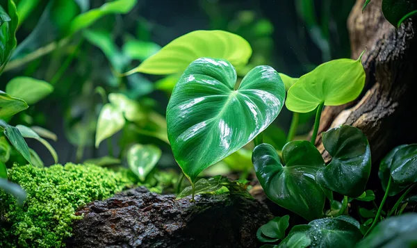 - Philodendron: Diese Pflanze bevorzugt ein feuchtes Klima und bietet mit ihren großen Blättern ideale Versteckmöglichkeiten. Philodendren sind bekannt für ihr schnelles Wachstum und ihre Fähigkeit, sich an verschiedenen Oberflächen festzuhalten.