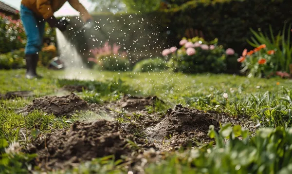 - Hügel einstampfen: Drücken Sie die Maulwurfshügel fest ein, um deren Eingänge zu verschließen.