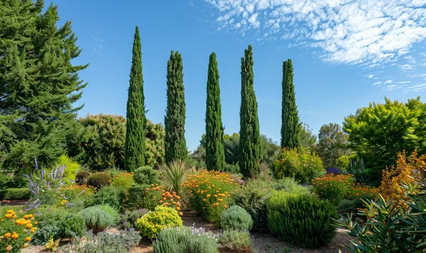 Drillingsblumen und Zypressen schaffen eine beeindruckende mediterrane Gartenkulisse